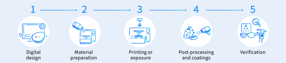 While no additive manufacturing technology has yet become fully viable for large-scale ophthalmic lens production, proposed additive workflows generally follow a similar conceptual structure. Companies investing in additive manufacturing use these common elements to guide their engineering decisions as they apply different techniques to the ophthalmic industry. These steps describe how additive lens manufacturing is typically envisioned, rather than an established, production-ready process: